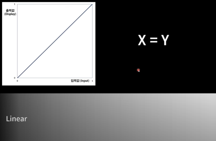 1대1 형태로 대입되는 직선 형태의 입출력 값을 제곱해서 보정해줌.(결과값이 더 어두워짐)