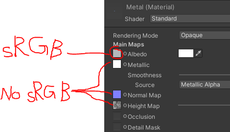 Albedo는 sRGB체크, Metalic, Normal, Height 등은 sRGB 체크 해제