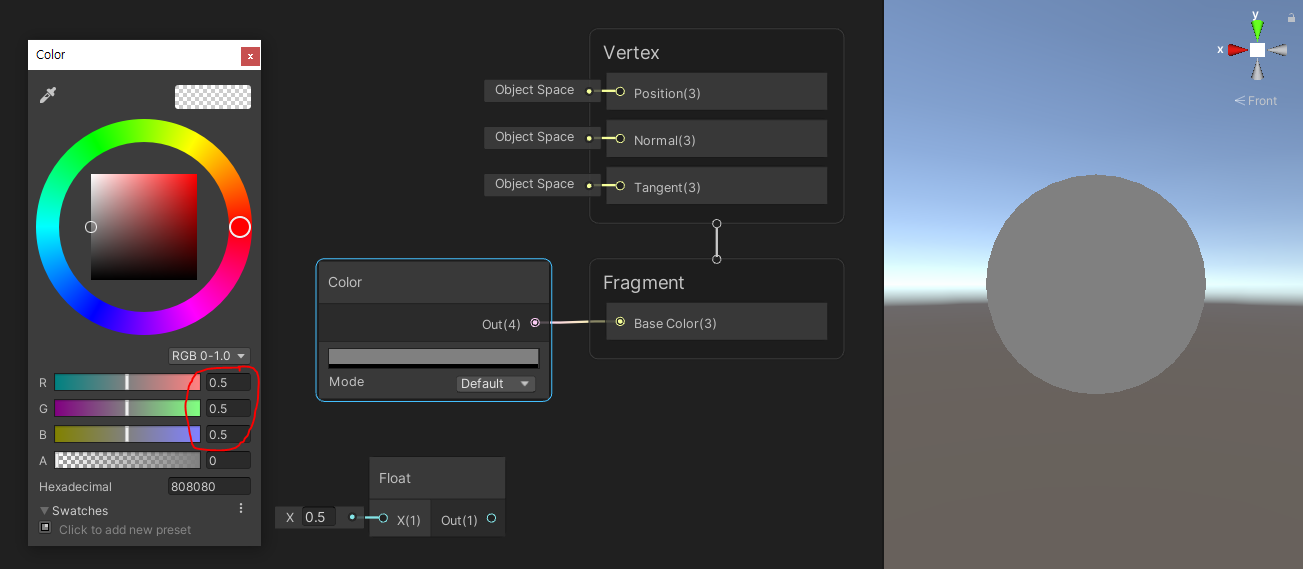 쉐이더 그래프에서 만든 Color(0.5, 0.5, 0.5)를 Base Color에 넣은 결과와