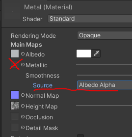 그러면 Metallic Alpha를 사용하지 못하므로 source에서 Albedo Alpha를 선택하면 알베도의 알파값을 Smoothness로 사용.
