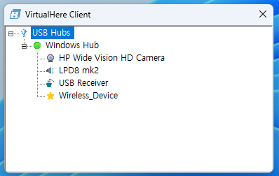 Virtual Here 클라이언트 프로그램에서 서버 PC의 USB디바이스 서버의 장치들을 볼수 있고 연결 할 수 있음