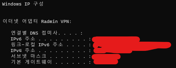 명령 프롬프트(CMD)에서 ipconfig를 보면 서버 컴퓨터와 클라이언트 컴퓨터 둘다 Radmin VPN이라는 네트워크에 연결된 것을 확인할 수 있음