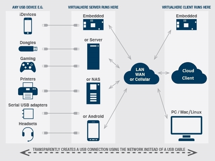 VirtualHere allows USB devices to be used remotely over a network just as if they were locally connected! Traditionally USB devices needed to be plugged directly into your computer to be used. With VirtualHere this is no longer required, the network its
