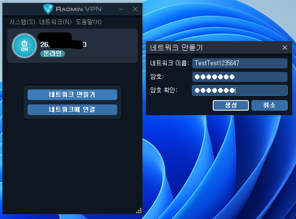 Radmin 프로그램 설치하고 실행하면 가상 네트워크 IP가 있음