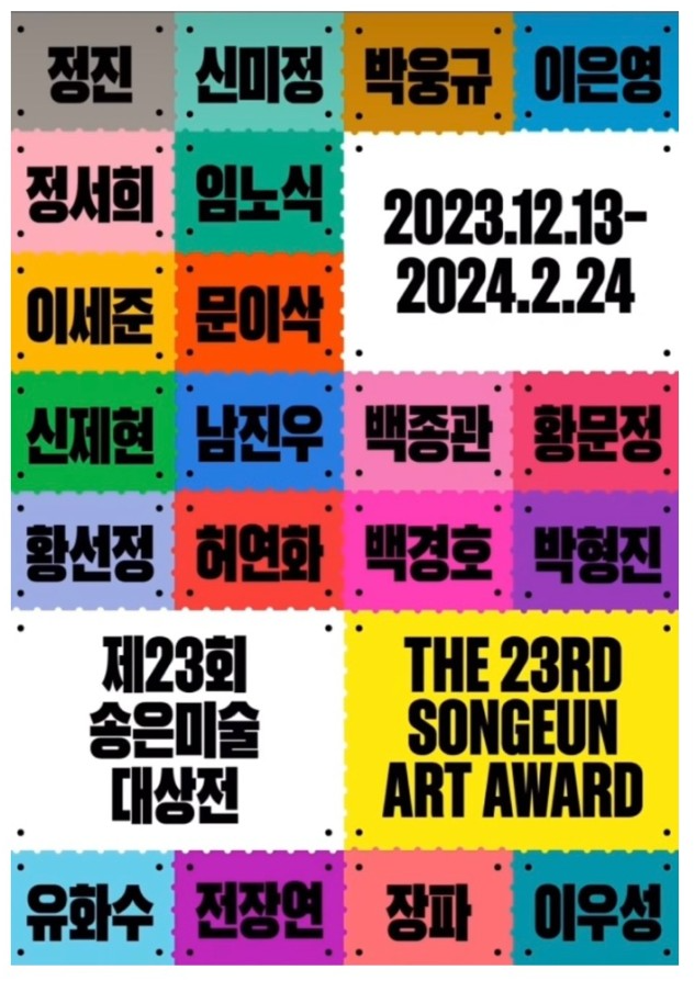 제23회 송은미술대상전은 개편 후 세 번째 개최되는 공모전으로 512명의 지원자 중 올해 2월 예선 심사를 거쳐 본선에 오른 작가 20인이 참여하며, 전시 기간 중 최종 심사를 거쳐 대상 1인이 선정됩니다. 이번 전시를 통해 회화, 조각, 설치, 영상, 사운드 등 여러 매체를 아우르는 동시대 한국 미술의 다양한 모습을 살펴보시기 바라며, 참여작가 남진우, 문이삭, 박웅규, 박형진, 백경호, 백종관, 신미정, 신제현, 유화수, 이세준, 이우성, 이은영, 임노식, 장파, 전장연, 정서희, 정진, 허연화, 황문정, 황선정에게 따뜻한 격려와 관심 부탁드립니다.