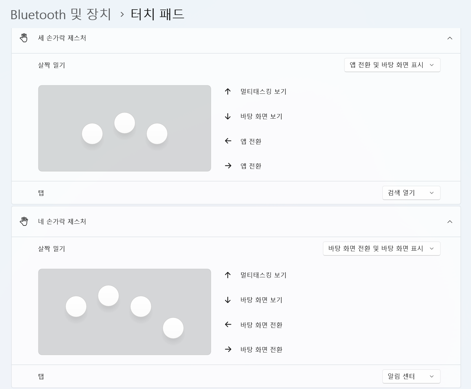 윈도우11에는 기본적으로 3손가락, 4손가락을 이용한 터치 제스쳐 기능들이 켜져 있음