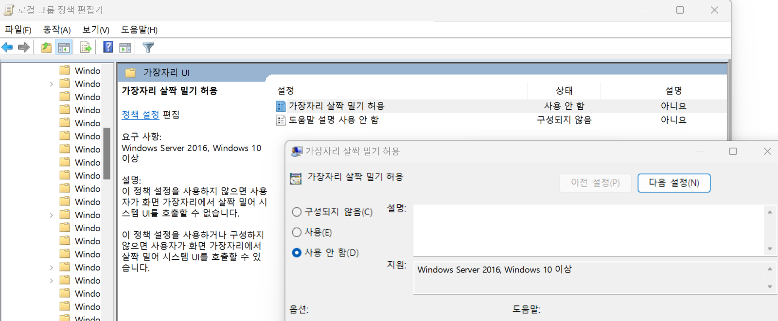 '가장자리 살짝 밀기 허용' 기능을 사용 안함으로 설정