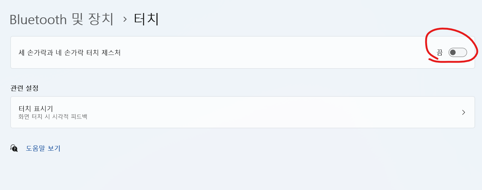 터치 설정에서 3손가락, 4손가락 터치 제스쳐 끄기