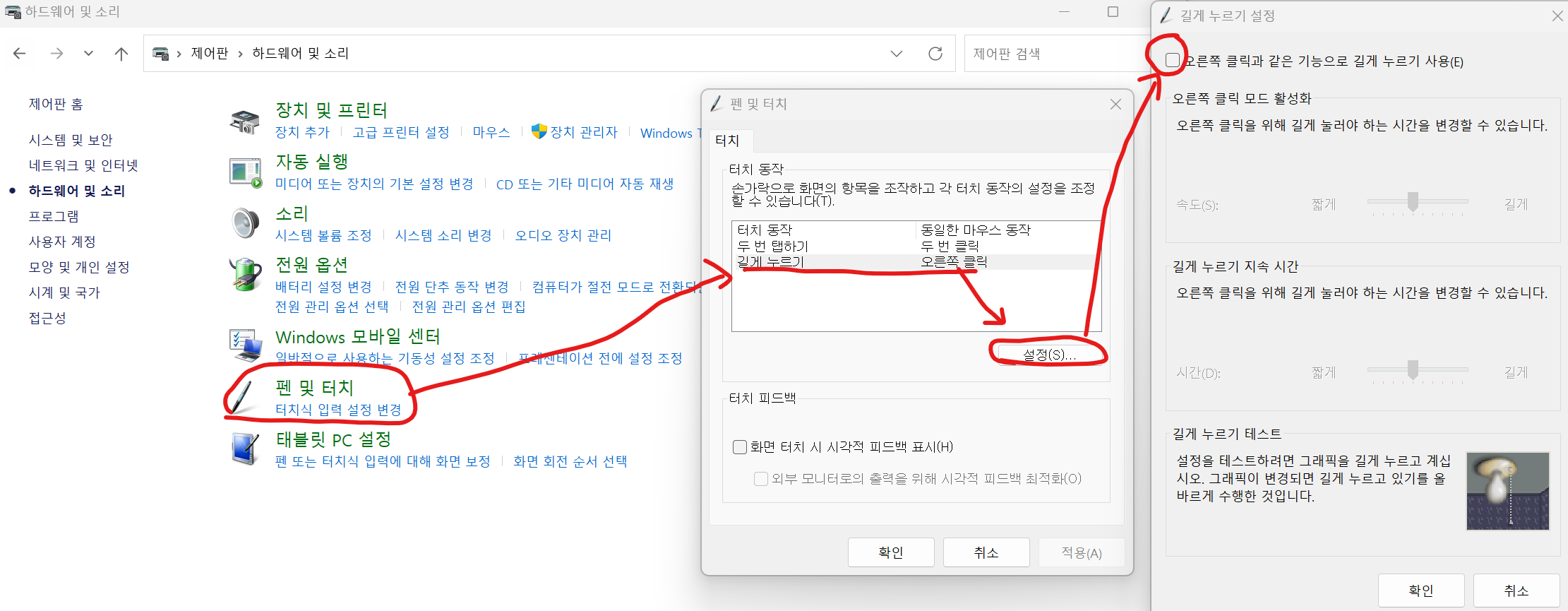 제어판 - 펜 및 터치 - 길게 누르기 설정 - '오른쪽 클릭과 같은 기능으로 길게 누르기 사용' 체크 해제