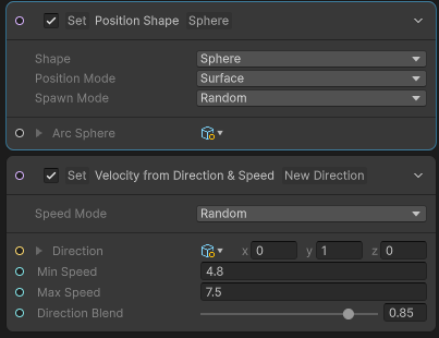 Initialize 단계에서 Sphere 영역에서 생성되고 Y축 방향으로 4.8~7.5의 스피드로 0.85로 지정된 각도로 발사되는 파티클