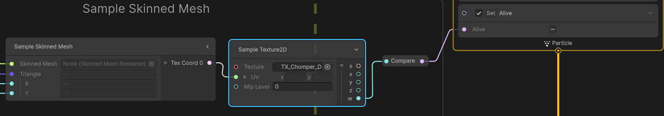 Set Alive에 연결된 노드를 보면 Sample Texture 2D에서 w값을 받아서 쓰고 있다.