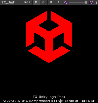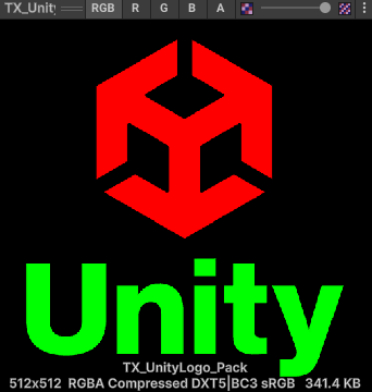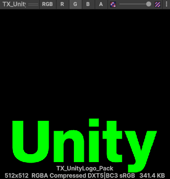불러온 텍스쳐는 R채널에는 유니티 로고, G채널에는 Unity 텍스트가 있다.