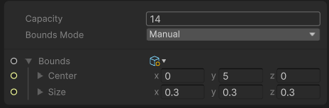 y축으로 좀 위로 Bounds를 설정하고 카메라 Frustum 영역에 들어오면 VFX가 렌더 된다.