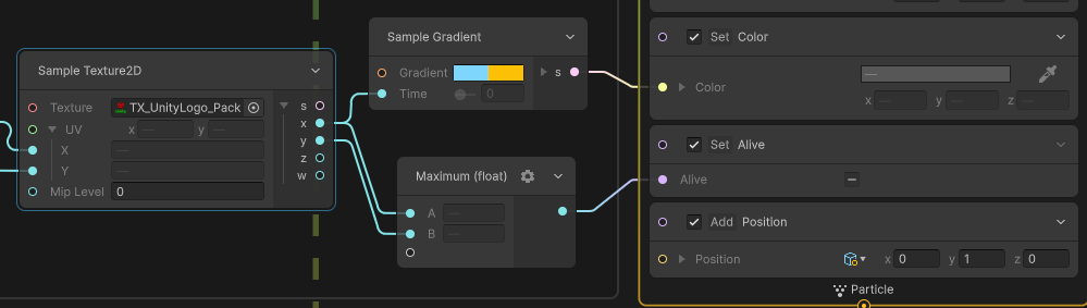 Set Alive 노드는 0이면 해당 파티클은 생성하지 않고 1이면 해당 파티클을 생성하는 노드로