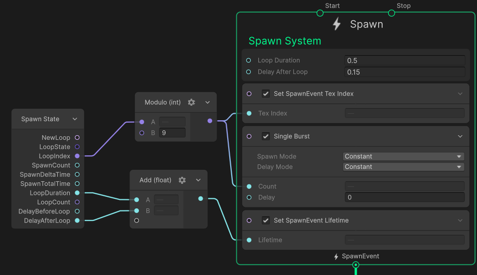 Spawn Sate에서 LoopIndex의 값은 새로운 스폰 루프가 반복할 때마다 증가하며 이 값을 Module(나누기 해서 나온 나머지 값) B를 9로 지정해서 결과값이 0~8사이의 값(총9가지)가 반복해서 나오게 한다.