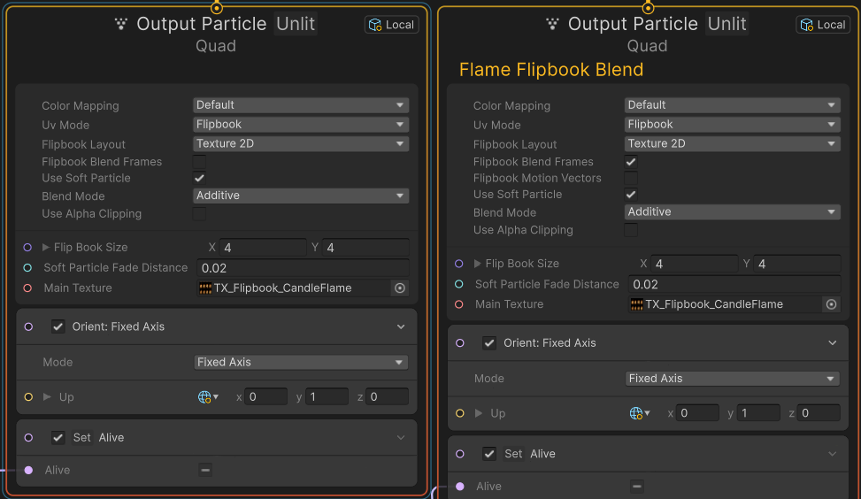 Flipbook 애니메이션에서 Blend 모드와 비교해서 보여주는 VFX Graph 샘플