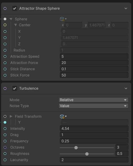 Update 단계에서 Attractor Shape Sphere(이전 버전에서 Force-Conform to Sphere)로 구 위에 인력으로 끌어당기는 역할과