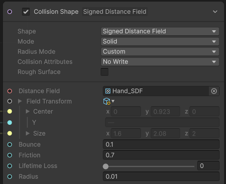Update 단계에서도 SDF를 사용해서 계속 손 표면으로 파티클들이 다니게 하고 Turbulence로 랜덤하게 흐르게 만든다.