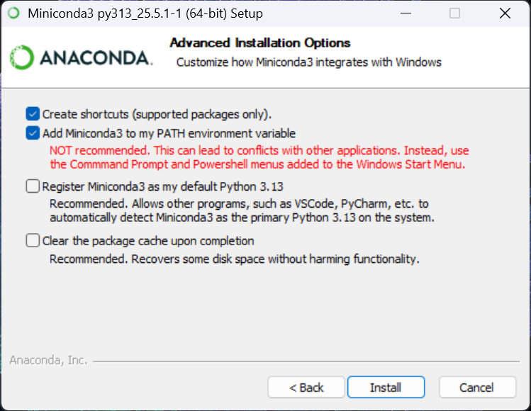 설치 시 두번쨰 옵션(Add Miniconda3 to my PATH environment variable) 체크