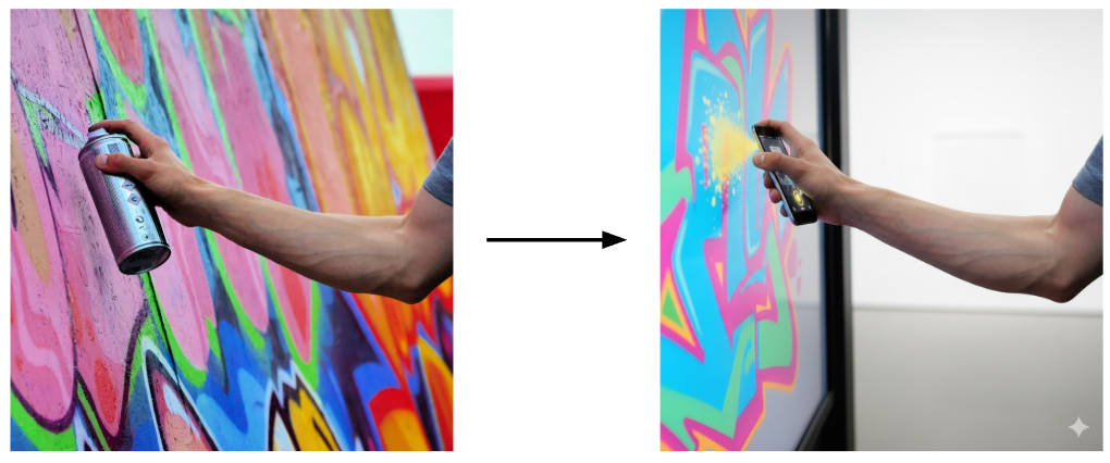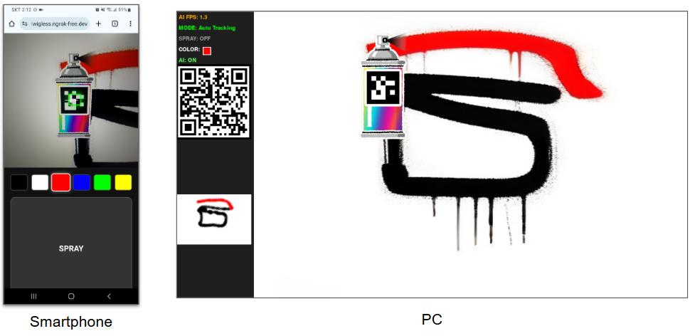 이 작품은 사용자의 스마트폰을 스프레이처럼 활용하는 새로운 인터랙션을 제공합니다. 사용자는 QR코드를 통해 접속한 모바일 웹페이지에서 카메라로 동적 마커를 인식하며, 실제 벽에 그리는 듯한 움직임으로 미디어 월에 드로잉합니다. 이때, AI 모델인 StreamDiffusion이 낙서와 같은 드로잉을 실시간으로 그래피티 아트로 변환하여 즉각적인 시각적 만족감을 제공합니다.